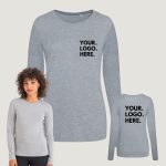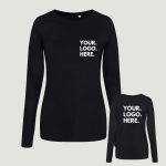 Get your business branded up with these long sleeve women’s branded t-shirts. They come with small logo printed on the front and large logo on the back as standard. Any logo is possible with any colours – just follow the logo instructions.